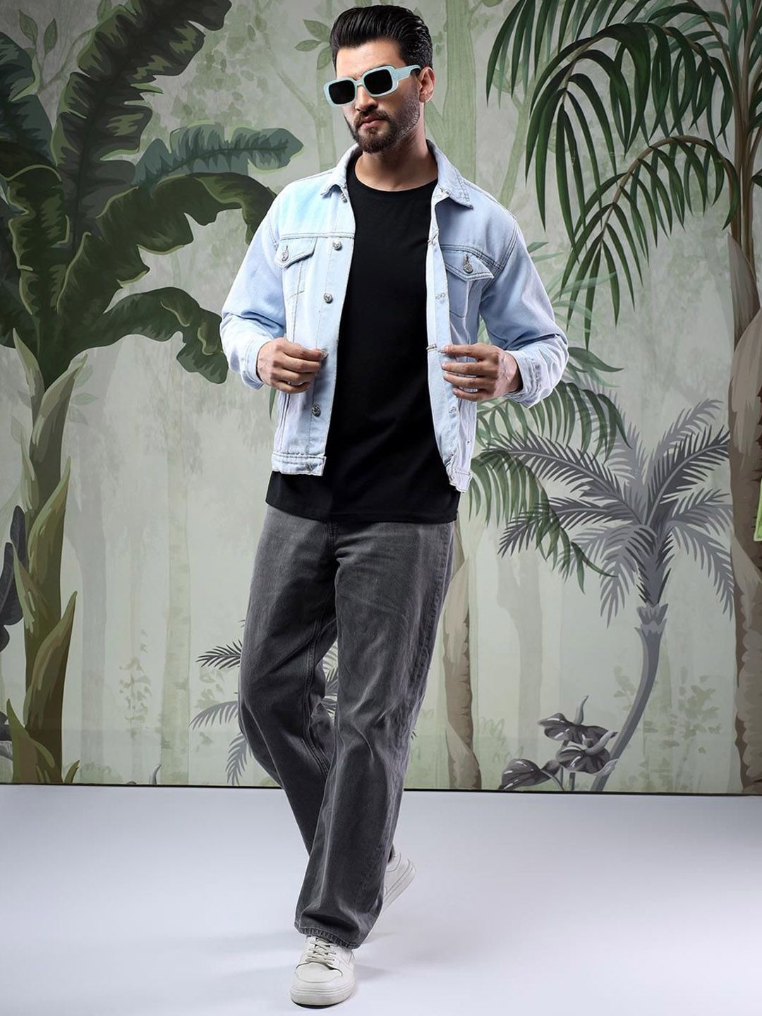 Kotty Men Solid Spread Collar Insulator Pure Cotton Denim Jacket