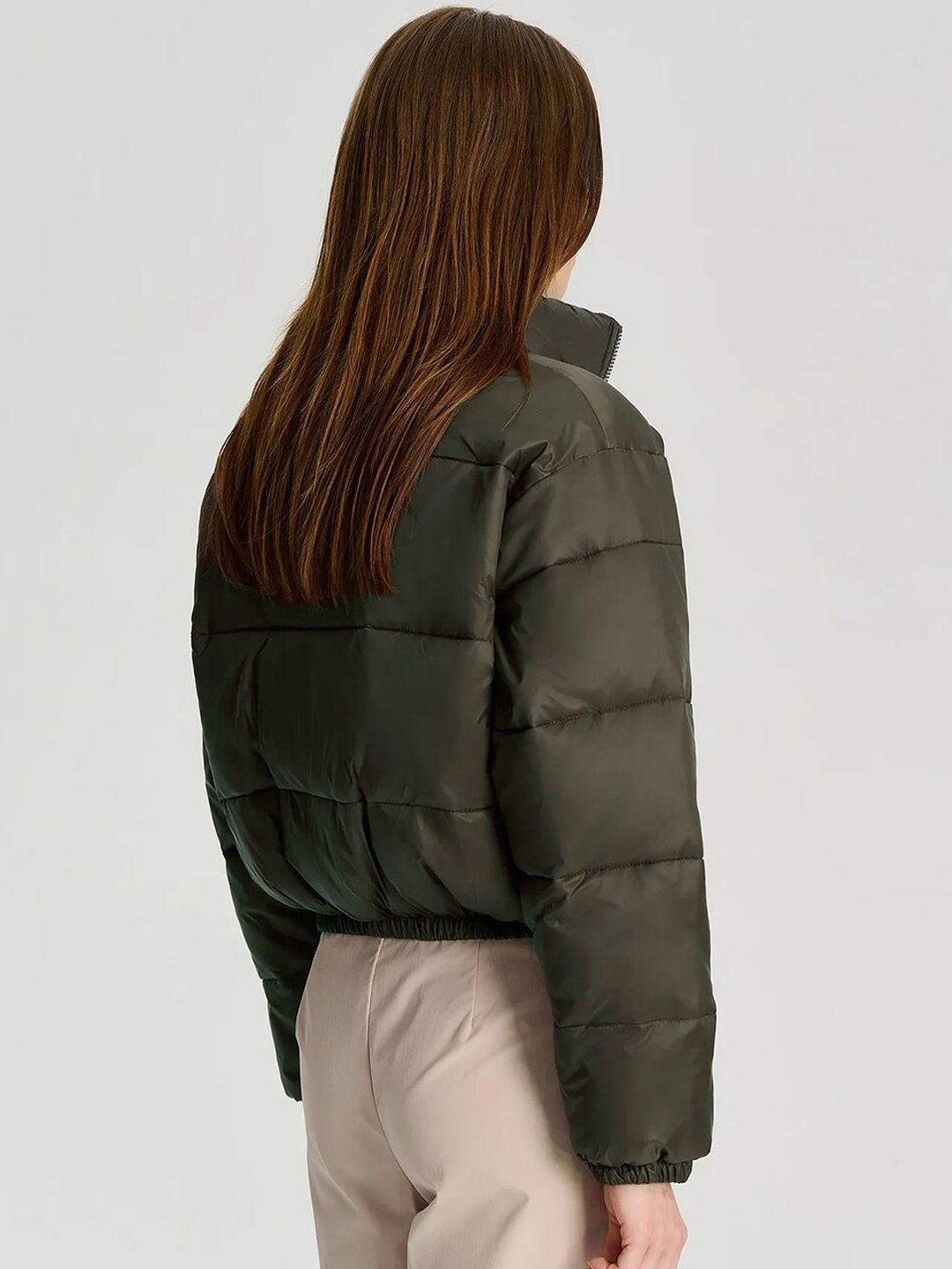 Product Details: Olive green solid puffer jacket, has a mock collar, 2 pockets ,has a zip closure, long sleeves, straight hemline, polyester lining || SIZE & FIT: The model (height 5'8) is wearing a size S || MATERIAL & CARE: NylonMachine Wash