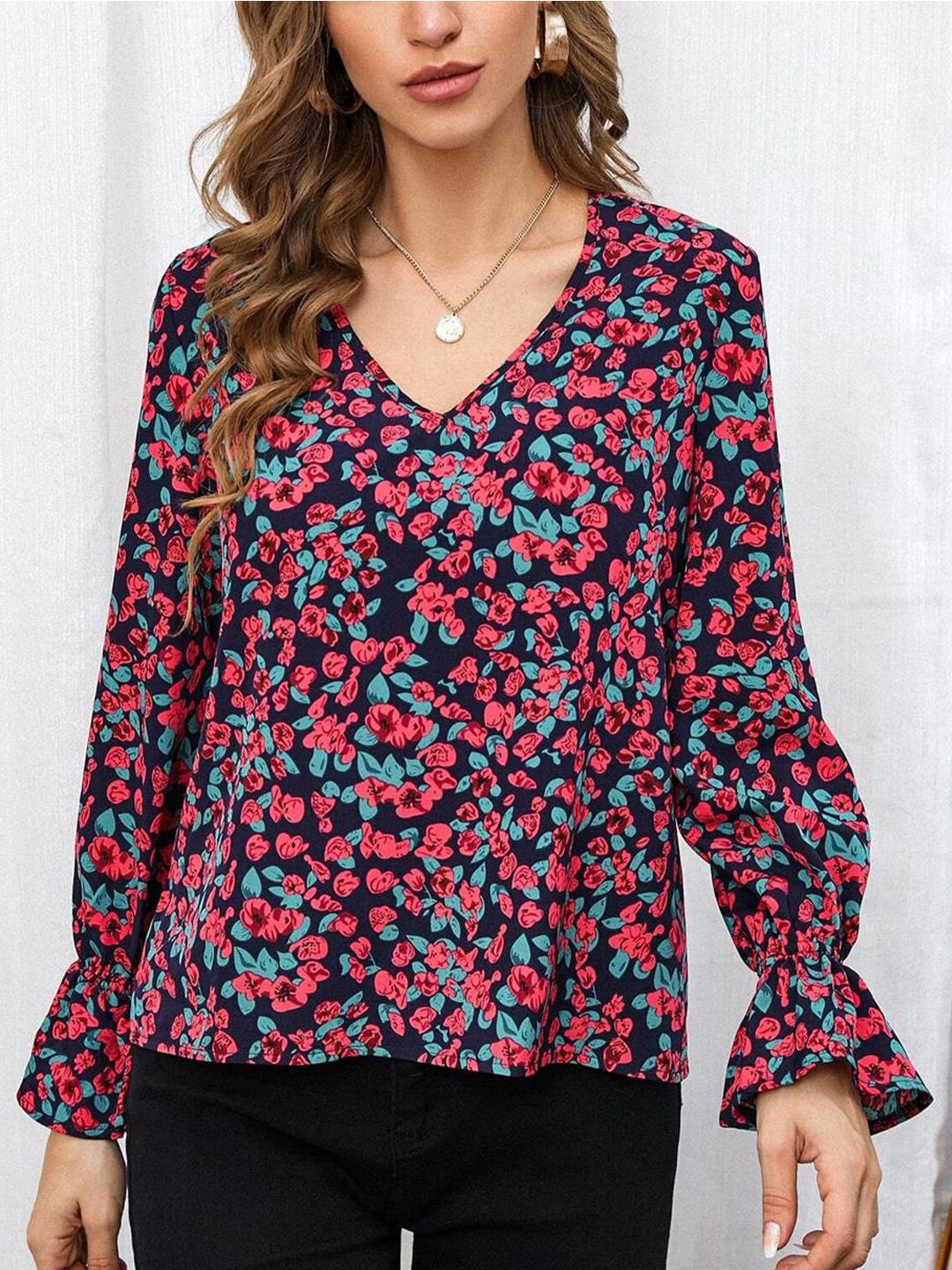 Kotty Navy Blue & Red Floral Print Bell Sleeve Satin Top