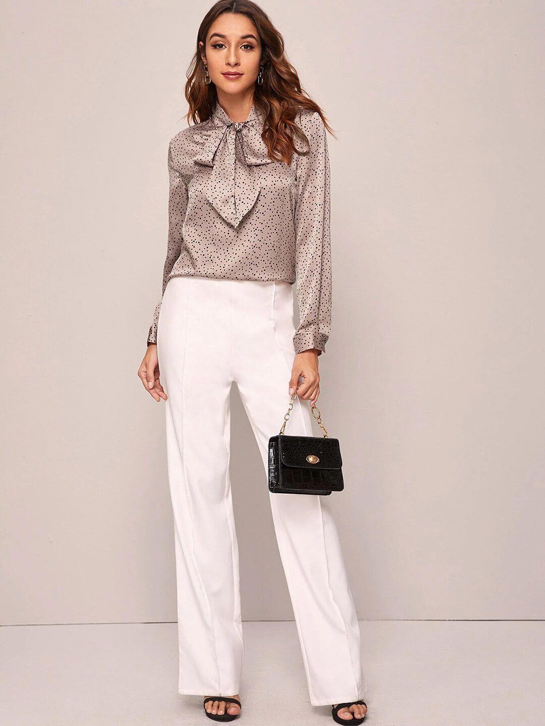 Kotty Pink Polka Dots Print Tie-Up Neck Satin Shirt Style Top