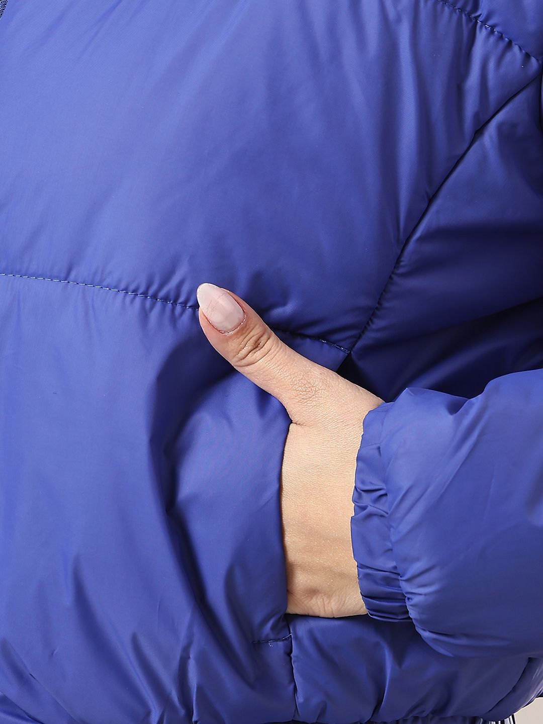 Product Details: Blue casual jacketMock collarPuffer jacketLong sleevesStraight hemlinePolyester lining || MATERIAL & CARE: NylonMachine Wash || SIZE & FIT: The model (height 5.8') is wearing a size S